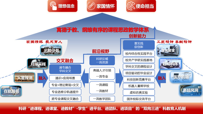 秉承百年机电师风传承,持续发扬“大师+团队”特色优势,引育并举打造高素质、高质量师资队伍,形成了探月工程、在轨服务等领域国之重器打造与杰出人才培养深度融合发展的新模式。宇航空间机构及控制技术教师团队入选“全国高校黄大年式教师团队”,机器人技术与系统全国重点实验室获“全国专业技术人才先进集体”荣誉称号;“空间机器人与遥操作创新团队”入选“科技部创新人才推进计划重点领域创新团队”,1个团队获评重点领域创新团队奖,1个团队获评重点领域十大创新人物(团体)称号;邓宗全院士团队被授予“探月工程嫦娥五号任务先进集体”,高海波获评“火星探测任务先进个人”,邓宗全院士、姜生元教授分别作为嫦娥五号、六号任务代表受到习近平总书记接见;邓宗全院士荣获2020年黑龙江省最高科学技术奖、李隆球获“中国青年科技奖”、丁亮获 “科学探索奖”。