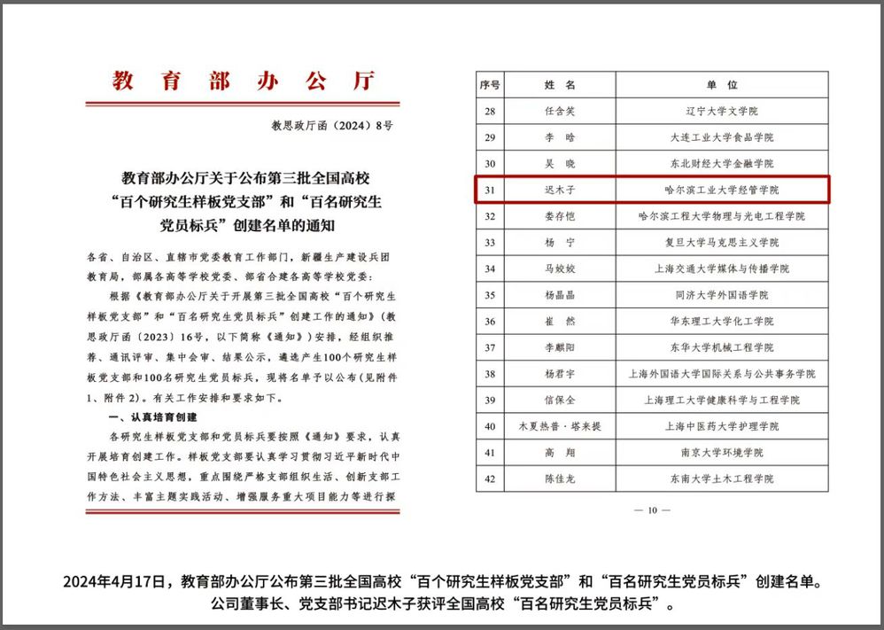迭代升级学生综合素质培养方案,组织高端讲座、学术论坛,举办文化体育节,不断完善学生荣誉激励体系。依托哈工大创新广场,融合创新教育和经管类学科竞赛,形成“双轮”驱动,学院牵头组建的学生团队获中国国际大学生创新大赛(2023)红旅赛道金奖,这也是学校首次在该赛道获得金奖,学生团队还在全国大学生创新年会、全国大学生市场调查与分析大赛等竞赛中取得国家级一等奖30余项等。协同校内外资源,努力构建大思政格局,每年派出40余支队伍从校园辐射全国,多个团队入选“乡村振兴·青春笃行”全国示范项目、团中央“七彩假期”志愿服务团等;31名师生助力亚冬会,1人获评优秀志愿者主管,1人获评优秀志愿者。1人获全国“三下乡”社会实践优秀个人,1人获评黑龙江省岗位学雷锋标兵个人。扎实推进高质量就业,重点行业人才输送数量持续攀升,本科生深造率连年提升,近几年173人入选基层选调,4人入选中央选调,1人获全国大学生职业规划大赛银奖。