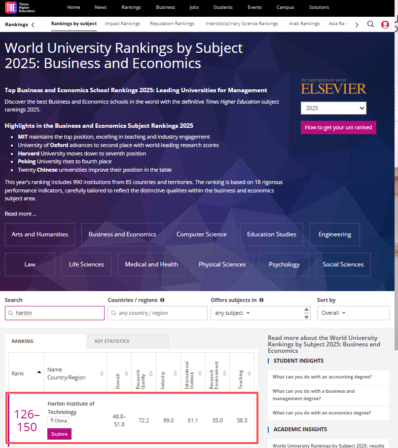 在2025泰晤士(THE)世界大学排名中,商业与管理学上升至第126-150位