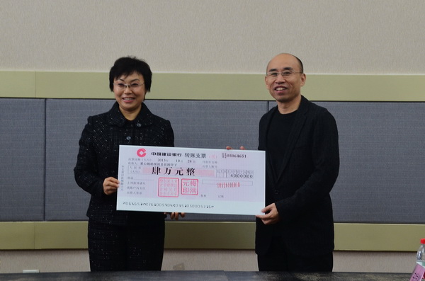 建筑设计研究院和建筑学院院长梅洪元将资助贫困学子的4万元支票送到绥滨县党委副书记潘云波手中。潘云波在讲话中回顾了我校捐赠棉被、帮助受灾群众渡过难关等事迹,介绍了绥滨县的灾情和灾后重建情况,并对我校的种种帮助表示衷心感谢。