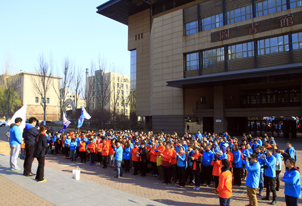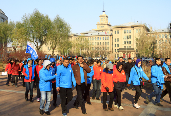 协会成立仪式结束后,来自全校27个基层单位的385名教工,身着徒步协会T恤衫,经步行街、校外街、小体育场、篮球场和学子超市,返回终点站图书馆门前。沿途中徒步爱好者还向过往学生和老师宣传徒步运动的魅力和重要性,号召更多师生在业余时间加强锻炼、增强体质,同时还呼吁大家低碳出行、远离雾霾。