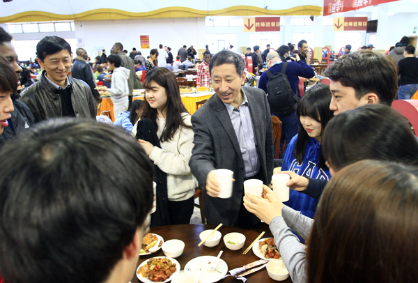 走访慰问结束后,校领导和相关学院、部处负责人来到学苑楼三楼餐厅,与500余名留校学生、留学生欢聚一堂、共度除夕。校领导们认真查看了饮食中心为学生准备的丰盛的年夜饭,并亲切慰问工作人员。精心装扮的餐厅内洋溢着浓浓的欢乐、祥和氛围,学生的喜悦之情溢于言表。