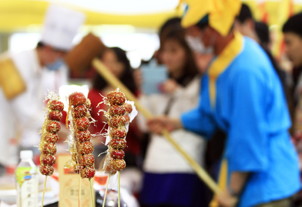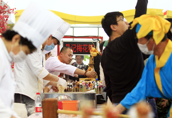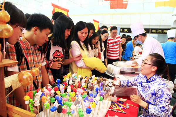 哈工大报讯(刘忠奎/ 兰锐/图)4月27日中午,学苑三楼阳光餐厅好不热闹,龙须酥、花生糖等鲜艳的幌子醒目地悬挂在小吃摊位前,吸引了众多师生前去一探究竟。原来,饮食中心举办的“留下手艺,迎五一民俗风情美食展”在此举行。