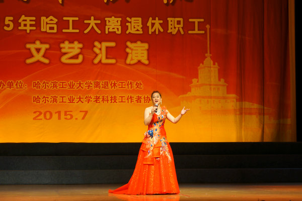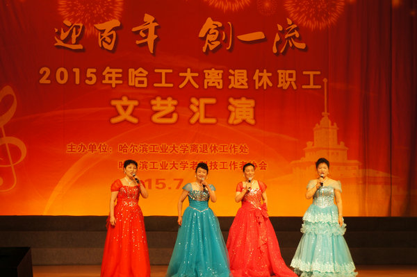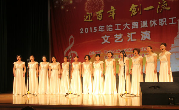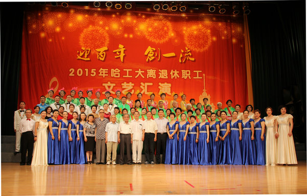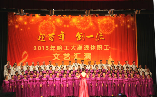 哈工大报讯(王平/文 舒国阳 丁宝昌/图)7月7日上午,由离退休工作处和校老科技工作者协会共同主办的“迎百年 创一流”哈工大离退休职工文艺汇演在主楼礼堂举行。老领导吴林、强金龙、赵汝祥与老同志共同观看了演出。老领导谭铭文、崔国兰、董书民和红枫林合唱团一起表演了大合唱《地道战》和《共筑中国梦》。