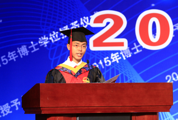博士毕业生代表、航天学院李贤伟在发言中表达了对学校、导师、家人和同学们的感谢与祝福。他说:“哈工大人是我们共同的身份,校训是我们的座右铭,我们将在振兴民族的伟大事业中去践行哈工大人应有的责任,不辜负学校、老师和家人的期待。”