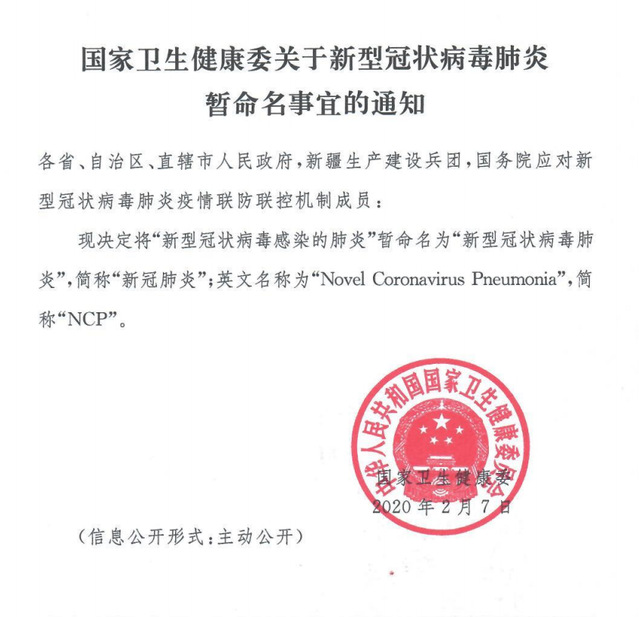 国家卫生健康委关于新型冠状病毒肺炎暂命名事宜的通知