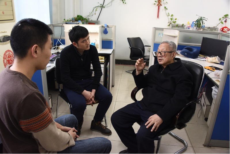 Qin Yukun discusses with his postgraduate students at Harbin Institute of Technology in February 2017. [Photo provided to China Daily]
