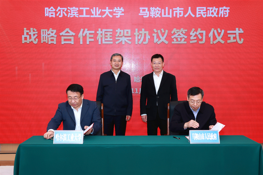 哈工大全媒体(商艳凯 文/图)11月21日,安徽省马鞍山市委常委、常务副市长黄化锋一行来校调研。校党委书记熊四皓与黄化锋共同见证校地双方签署战略合作框架协议。