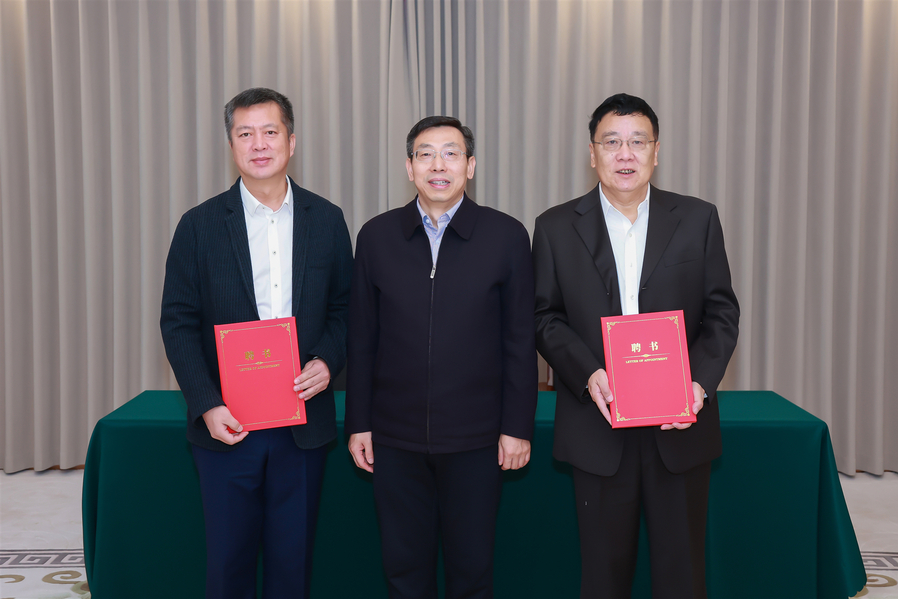 范奇向我校计算学部教授唐降龙、未来信息技术研究院副院长祖晓明颁发了马鞍山市“招才引智大使”聘书。