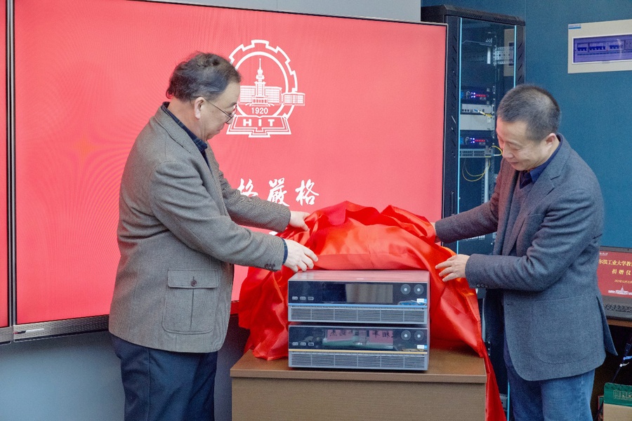 会上,我校原副校长、电气学院徐殿国教授和白小青共同为捐赠的教学仪器设备揭幕。