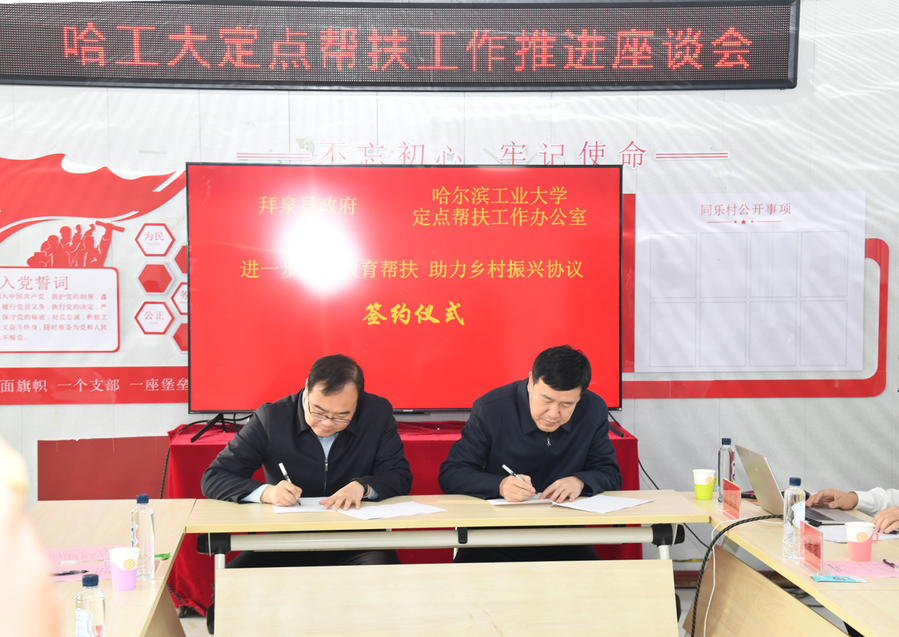驻村工作队汇报了2023年帮扶工作取得的新进展、新成效。一年来,驻村工作队坚持以党建引领乡村振兴,扎实开展第二批主题教育,推动习近平新时代中国特色社会主义思想深入人心、落地生根,设立“乡村振兴主题见学点”,把田间地头转化为师生开展“大思政课”的阵地,着力打造哈工大“功夫小园”和紫玉米等“紫色经济”,通过组建“同乐村好日子秧歌队”、举办“同心同乐 同庆丰收”文艺汇演等丰富村民文化生活,设立“同乐解难基金”,探索建立解决群众急难愁盼问题的工作机制。
