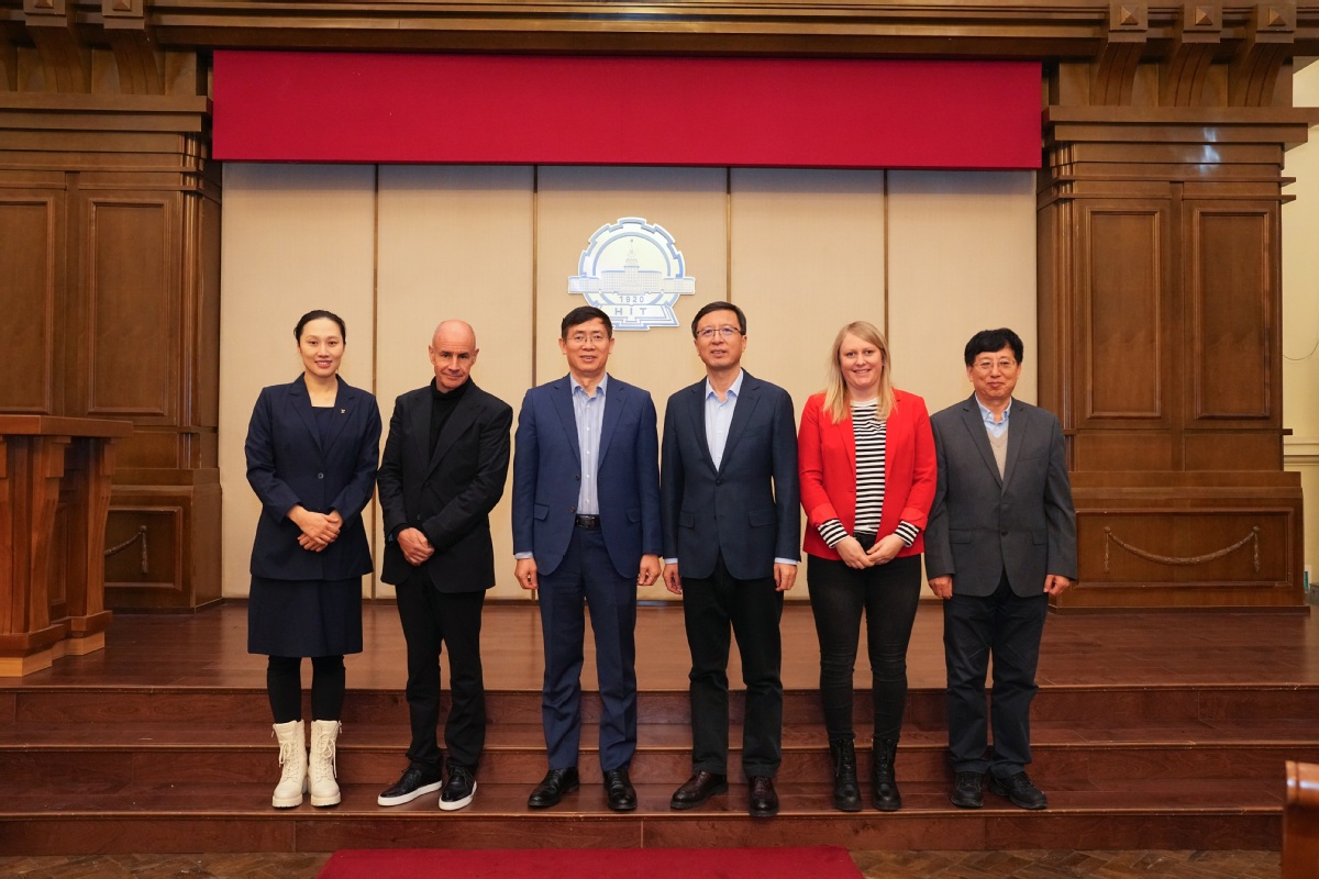中国奥委会副主席周进强和国际奥委会委员、国际雪联主席约翰·埃利亚施来哈工大调研