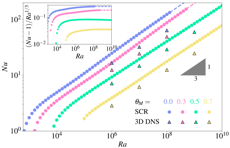 穿透对流广泛存在于较大尺度的自然现象中,如大气环流和海洋环流等。对流现象的标度率研究在对流的研究和建模中有着重要意义。美国著名地球物理学家乔治·维罗尼斯(George Veronis)于1963年猜想穿透对流中存在热量输运的经典标度率,即热流量与瑞利(Rayleigh)数之间具有1/3的标度关系。然而,在过去的60余年间,受限于实验室尺度和计算能力,这一标度率从未被确认过。