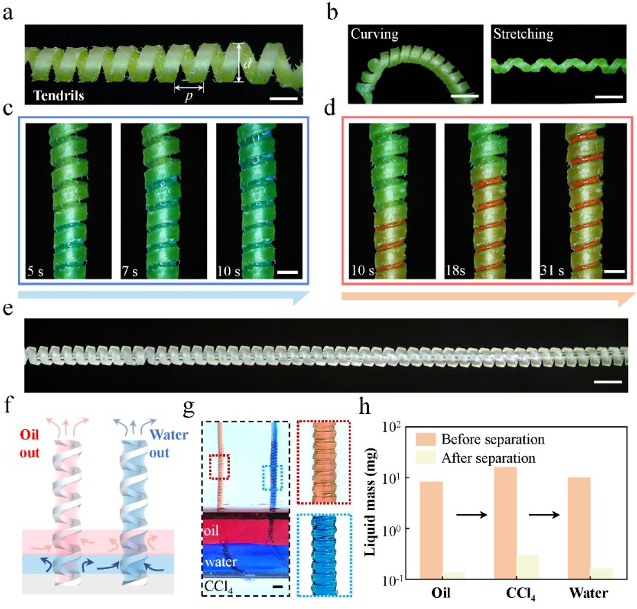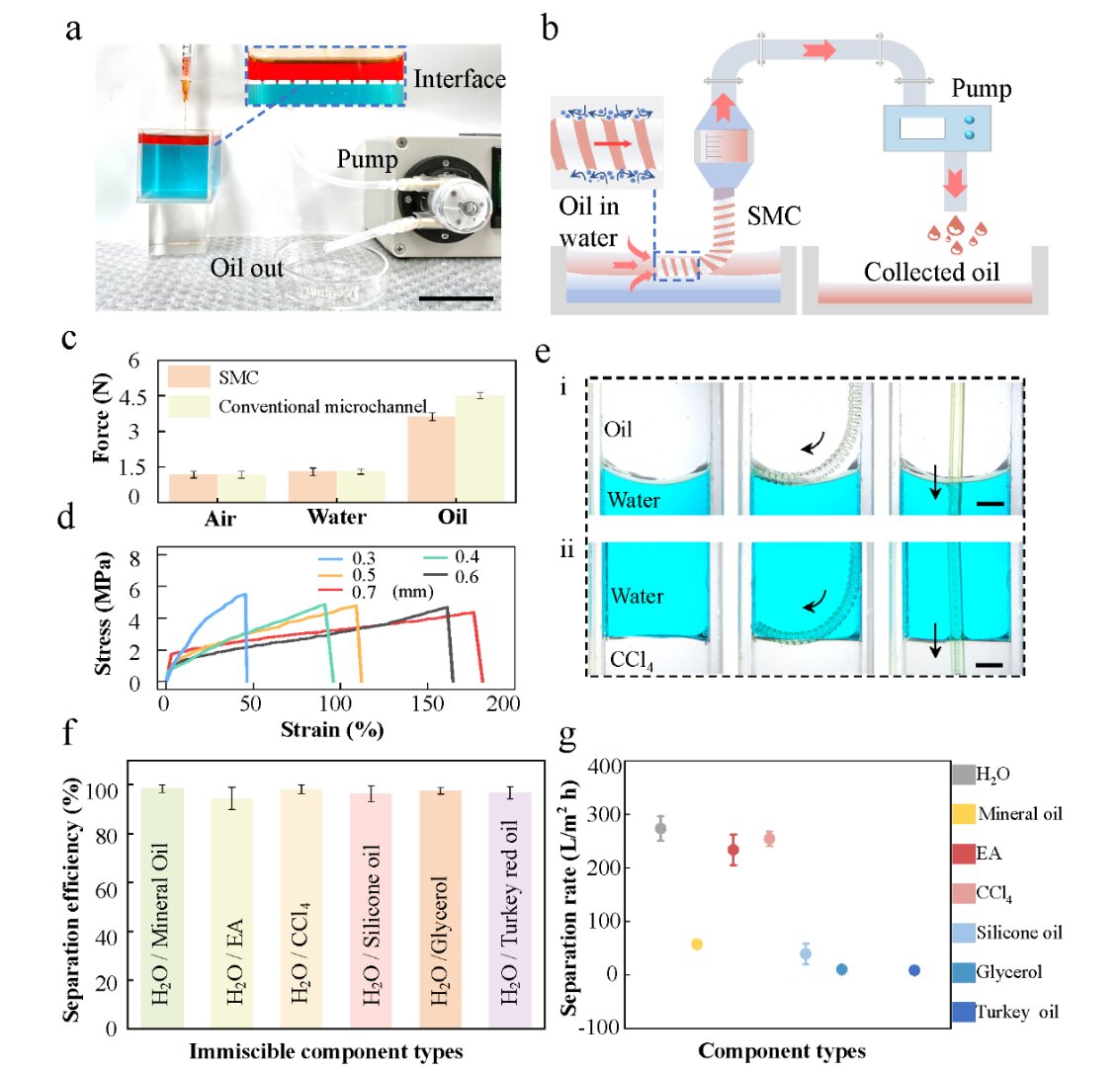 研究团队首创基于黄瓜卷须螺旋结构的仿生弹簧微通道(SMC),通过高精度投影微立体光刻3D打印技术实现微流控泵的仿生设计、极端制造与性能动态调控。该仿生功能系统创新性地融合表面润湿性与分子极性协同机制,突破传统分离器件依赖静态多孔材料的局限,成功实现油-水-四氯化碳等多相体系的界面极精准自主捕捉与物相高效连续分离,分离通量高达292.5 L m⁻² h⁻¹,效率稳定超过99%,攻克了传统技术界面识别困难、易堵塞等瓶颈问题(图1)。