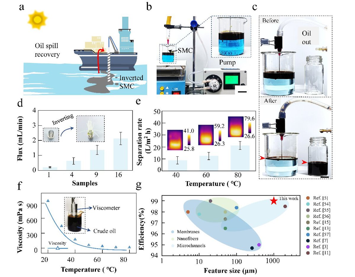 团队创新集成太阳能热调控模块,利用光热效应将高粘度原油分离速率提升至22.5 L m⁻² h⁻¹(图3)。该技术已成功应用于时空可控微反应平台构建,通过选择性移除隔离液相触发化学反应,在工业废水深度处理、原油泄漏应急回收、生物检测芯片开发等领域具有十分广泛的应用价值,为工业废水处理与生物医学检测提供了全新范式。