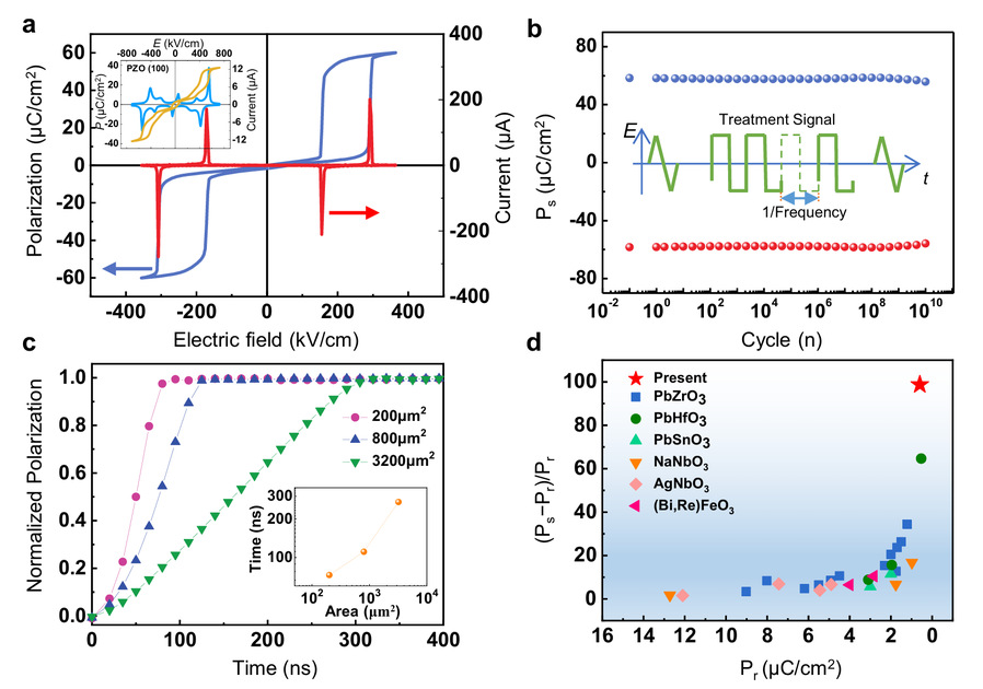 针对上述问题,团队通过第一性原理计算揭示了反铁电锆酸铅(PbZrO3)的各向异性机制,研究发现当外加电场方向与极化矢量平行时,其相变路径最简、能量壁垒最低。基于反铁电薄膜的原子级设计,沿[111]方向施加电场时,材料通过“一步式”直接切换反铁电-铁电相变,避免了中间态干扰。通过取向调控高质量薄膜外延生长,实现了电场驱动下一步完成反铁电-铁电相变,显著提升响应速度与稳定性,获得了反铁电薄膜标准的方形双电滞回线,饱和极化达60微库仑每平方厘米(μC/cm²),剩余极化接近零,经千亿次(10¹⁰)循环后性能无衰减,颠覆性提高了材料的疲劳极限。