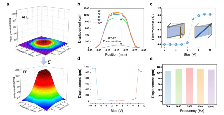 该高质量反铁电薄膜首次实现了0.83%双极性数字型电致应变,响应时间仅为75纳秒,且具备频率不敏感特性,这为高精度微机电系统(MEMS)提供核心材料支持。研究还结合原位同步辐射X射线衍射,解析了电场诱导下铁电相的晶体结构,揭示了数字型应变的结构起源。团队通过理论和实验的相互验证,深化了对反铁电材料本征行为的理解,更为设计高性能数字机电系统提供了理论依据和新的研发思路。