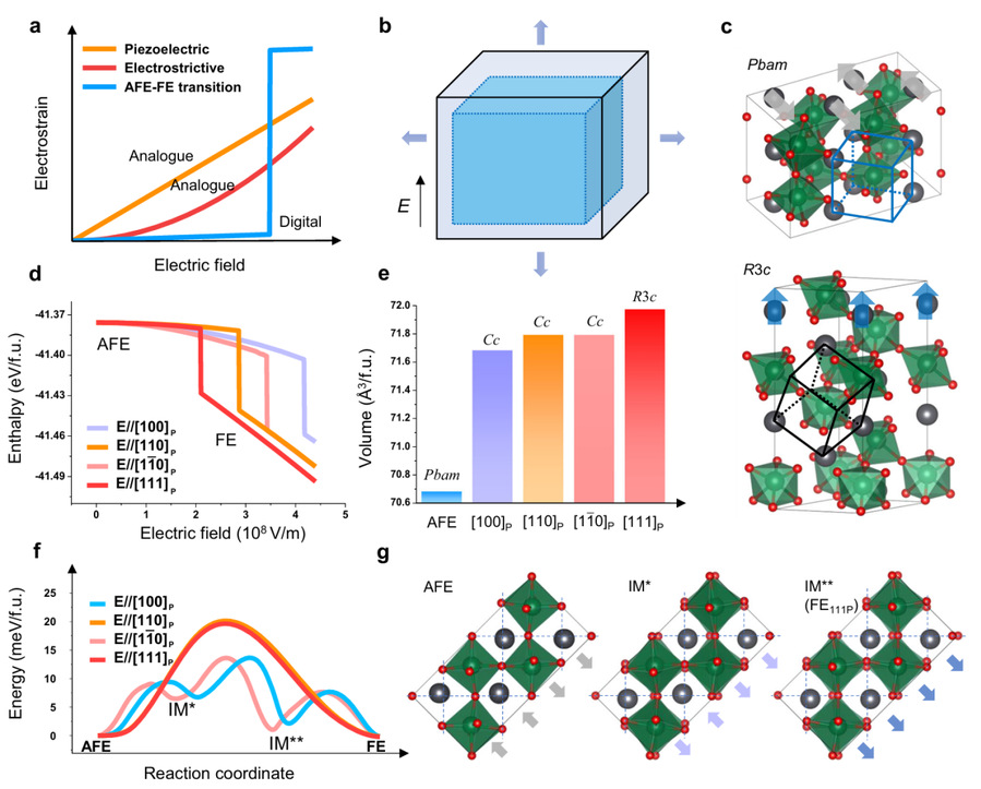哈工大全媒体(阚思邈 司洋洋 王舒邈/文 陈祖煌 司洋洋/图)近日,深圳校区前沿学部材料科学与工程学院陈祖煌教授团队联合苏州大学、新加坡科技研究局等单位,通过取向调控在(111)取向的锆酸铅(PbZrO3)外延薄膜中获得了优异的反铁电性能及数字型电致应变响应。研究成果以《锆酸铅(PbZrO3)外延薄膜中的理想反铁电性与高数字型电致应变》(Ideal antiferroelectricity with large digital electrostrain in PbZrO3 epitaxial thin films)为题发表在《自然通讯》(Nature Communications)上,揭示了各向异性反铁电-铁电相变机制,攻克了反铁电薄膜一直存在的剩余极化高、相变路径复杂等难题。该工作为反铁电薄膜器件设计以及高性能数字型电致应变器件的开发提供了全新理论框架与技术路径。