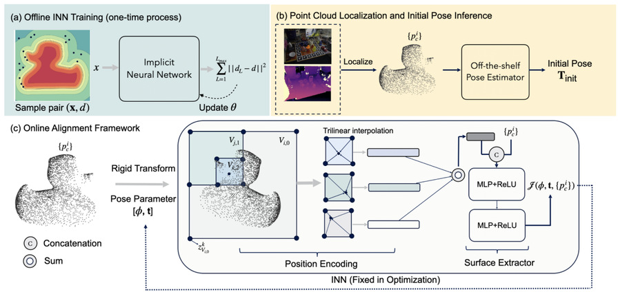 针对这一问题,研究团队提出了一种基于隐式神经网络的优化框架,通过将目标物体的3D模型编码为符号距离场(SDF),直接优化点云与模型表面的距离,无需显式匹配对应点。该方法具有多种优势:一是高效性,离线训练仅需4-5分钟,在线优化实时完成;二是鲁棒性,对初始位姿偏差大、噪声、尺度变化及遮挡等复杂场景表现优异;三是通用性,可无缝集成至现有位姿估计流程,无需额外标注数据。