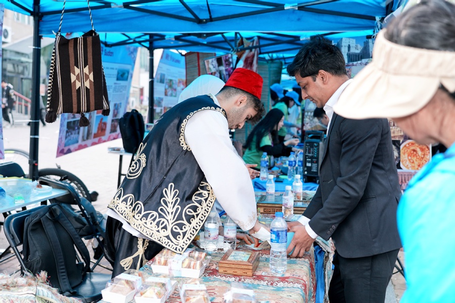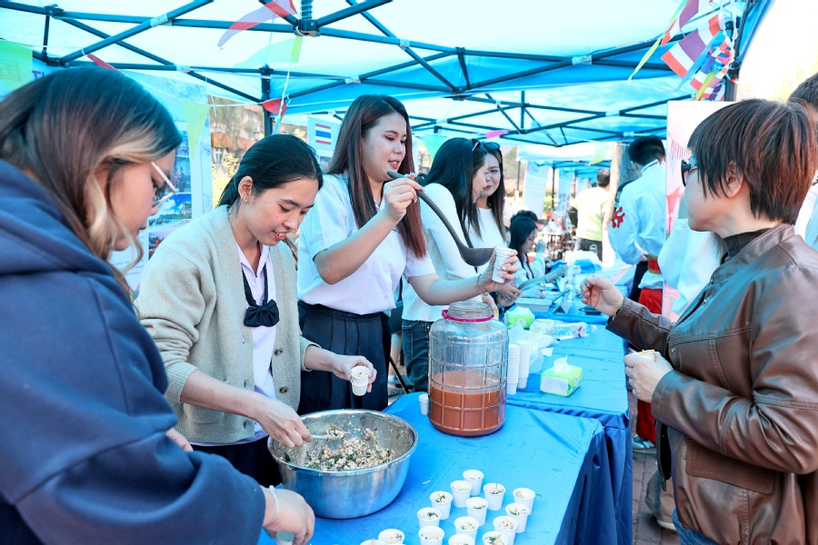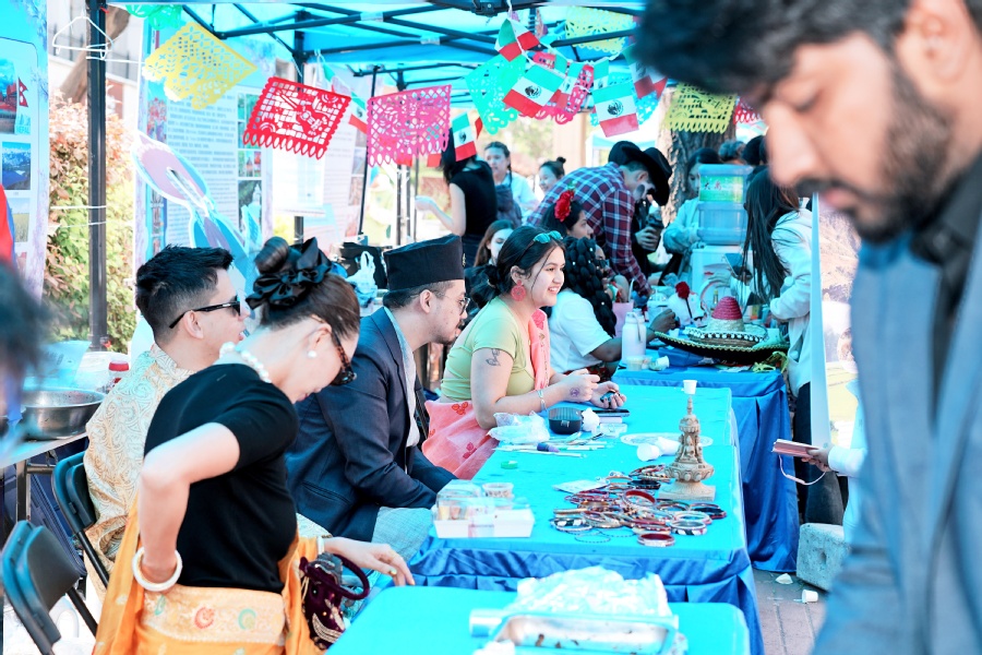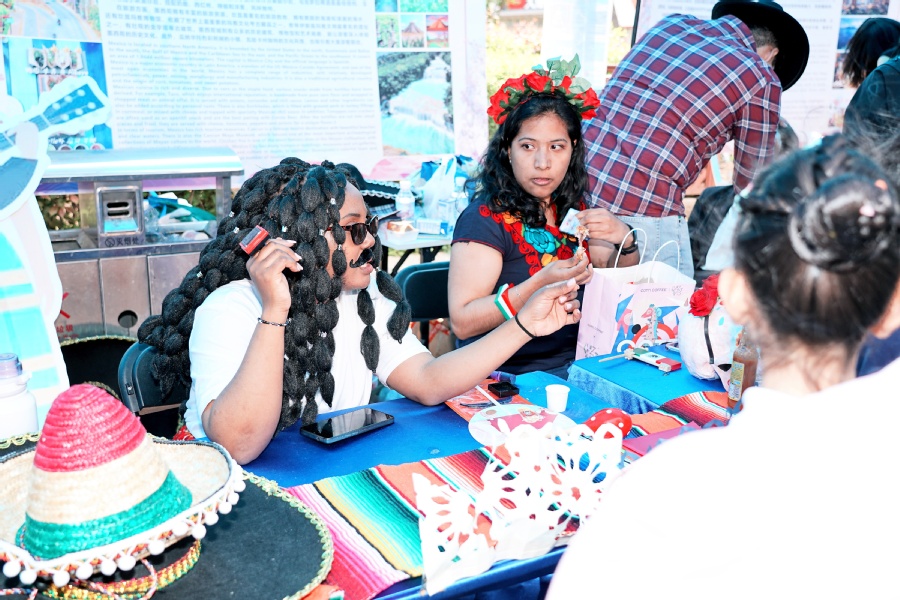 步行街现场设置了国别主题展区、非遗展区、来华留学招生展区、出国留学教育展区、帮扶项目特产展区,同学们了解各国具有代表性传统服饰、手工艺品,品尝特色美食,沉浸式体验国际文化,提升跨文化交流能力。