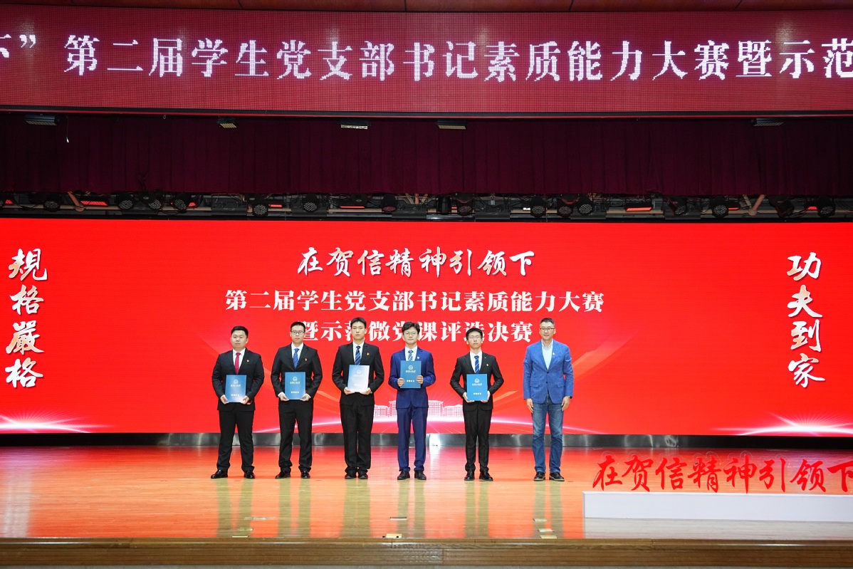 哈工大全媒体(张又元/文 辛然/图)6月3日,在学校收到习近平总书记贺信5周年和扎实开展深入贯彻中央八项规定精神学习教育之际,学校举办“在贺信精神引领下”第二届学生党支部书记素质能力大赛暨示范微党课评选决赛。校党委常委、组织部部长李明江出席活动并为获奖选手颁奖。