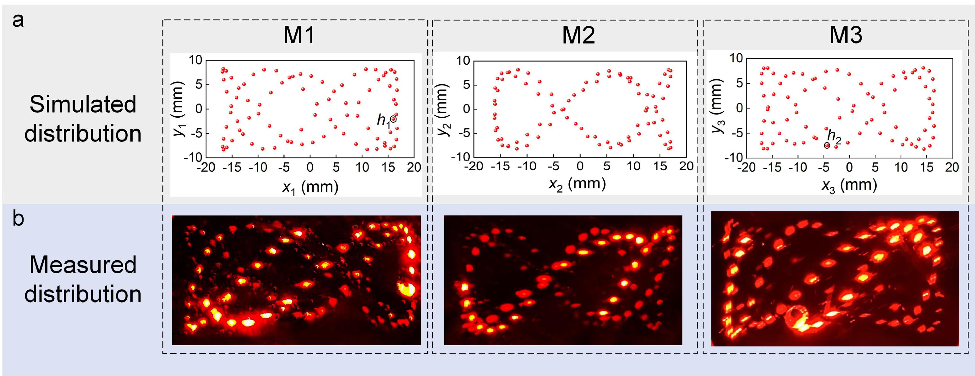 三片镜光斑图案:(a)仿真光斑分布;(b)实测光斑分布