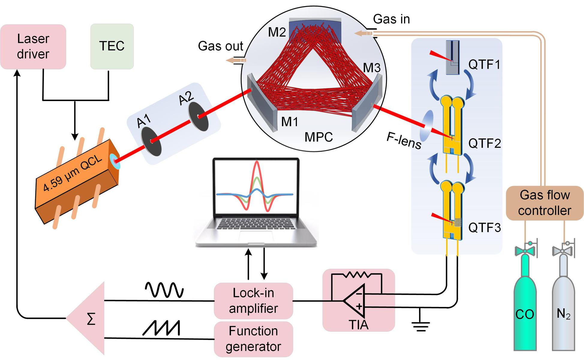 在半导体、能源、深空探测等前沿科技领域,超高灵敏度气体传感技术有着不可替代的应用价值。2018 年,马欲飞课题组提出了光致热弹光谱(Laser-induced thermoelastic spectroscopy,简称 LITES)技术,即激光穿透待测气体后,聚焦至石英音叉表面,利用石英音叉的光致热弹效应进行气体浓度的反演。该技术具有非侵入式、快速响应、全波段光谱检测等优势,迅速成为研究热点,然而想进一步提升其性能,在气体吸收强度、石英音叉探测器方面亟待创新突破。