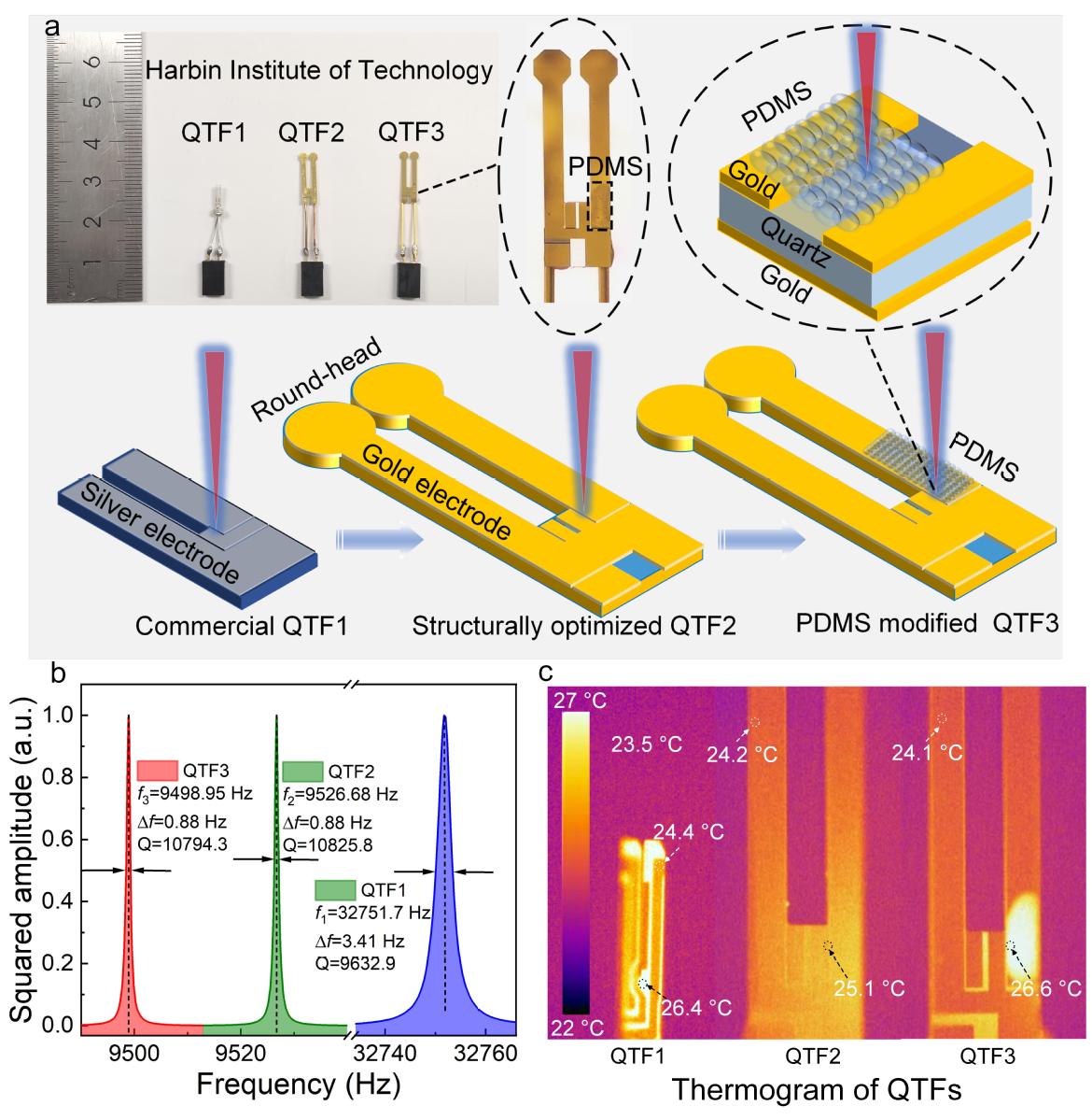 聚合物改性的圆形头低频石英音叉:(a)石英音叉优化示意图;(b)石英音叉频率响应;(c)石英音叉热像图