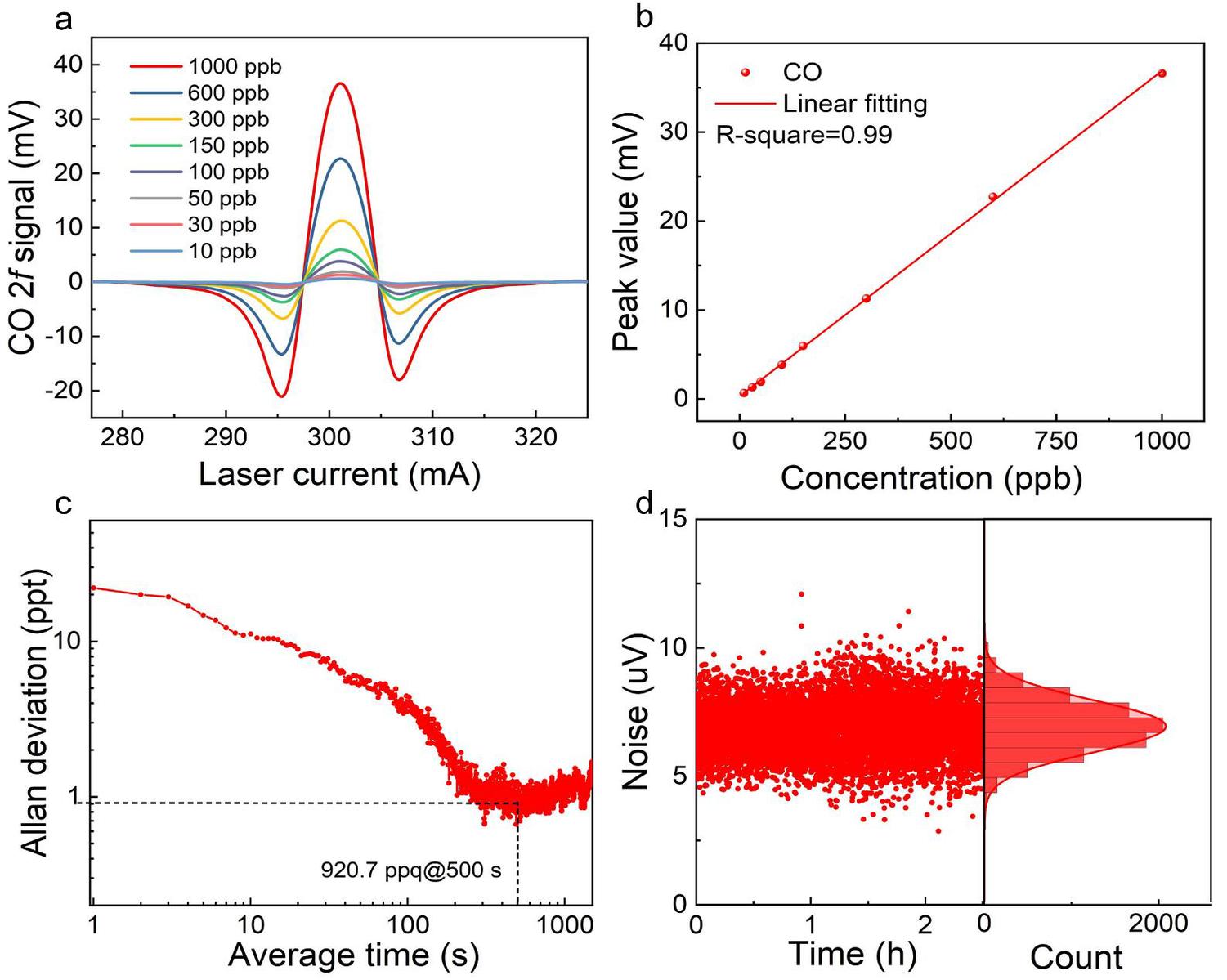 基于优化多通池和石英音叉的CO-LITES传感性能测试:(a)不同一氧化碳浓度下2f信号曲线;(b)浓度线性响应;(c)Allan方差分析;(d)噪声连续检测
