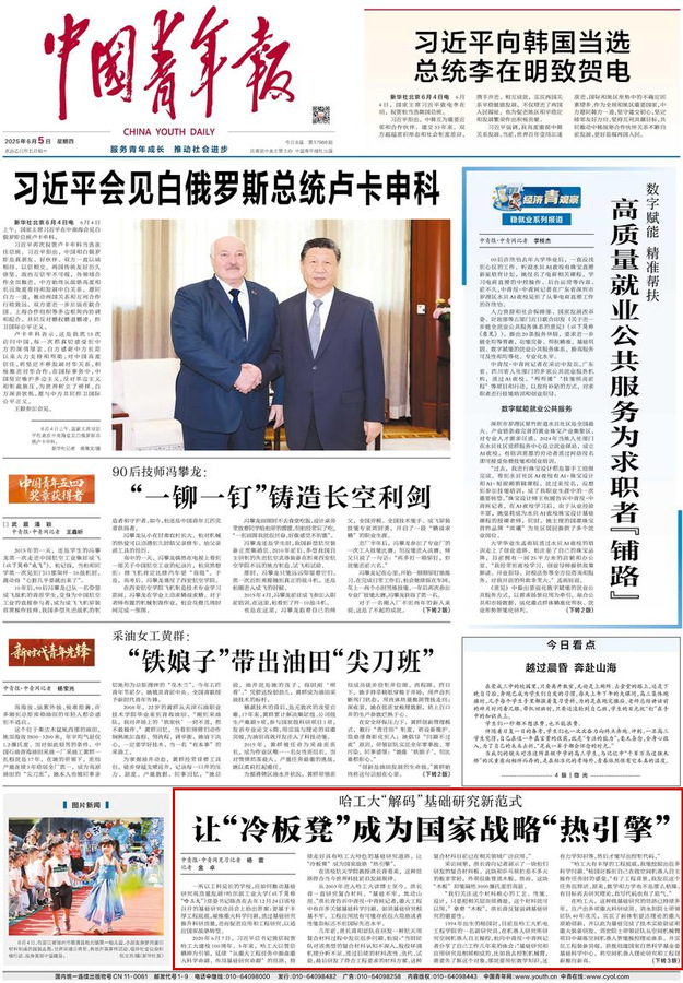 哈工大全媒体(商艳凯/文)6月5日,《中国青年报》头版以《哈工大“解码”基础研究新范式 让“冷板凳”成为国家战略“热引擎”》为题,聚焦近年来我校坚持以习近平总书记贺信精神为引领,持续走好具有哈工大特色的基础研究道路,让“冷板凳”成为国家战略“热引擎”。