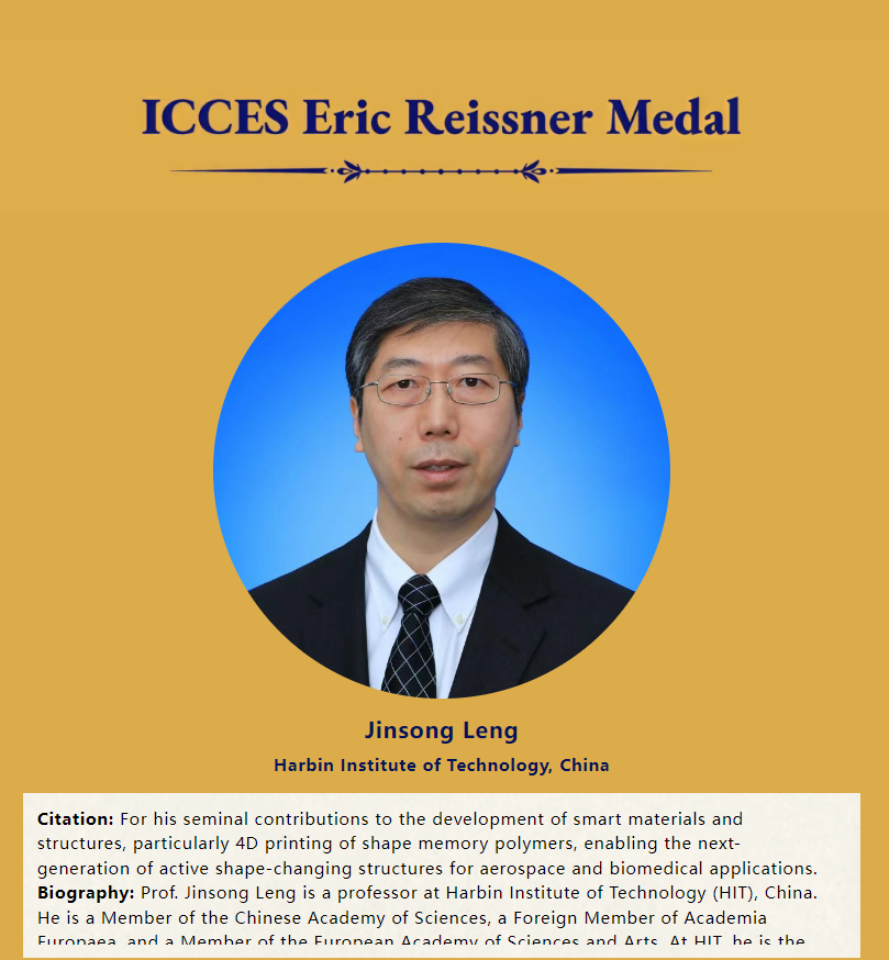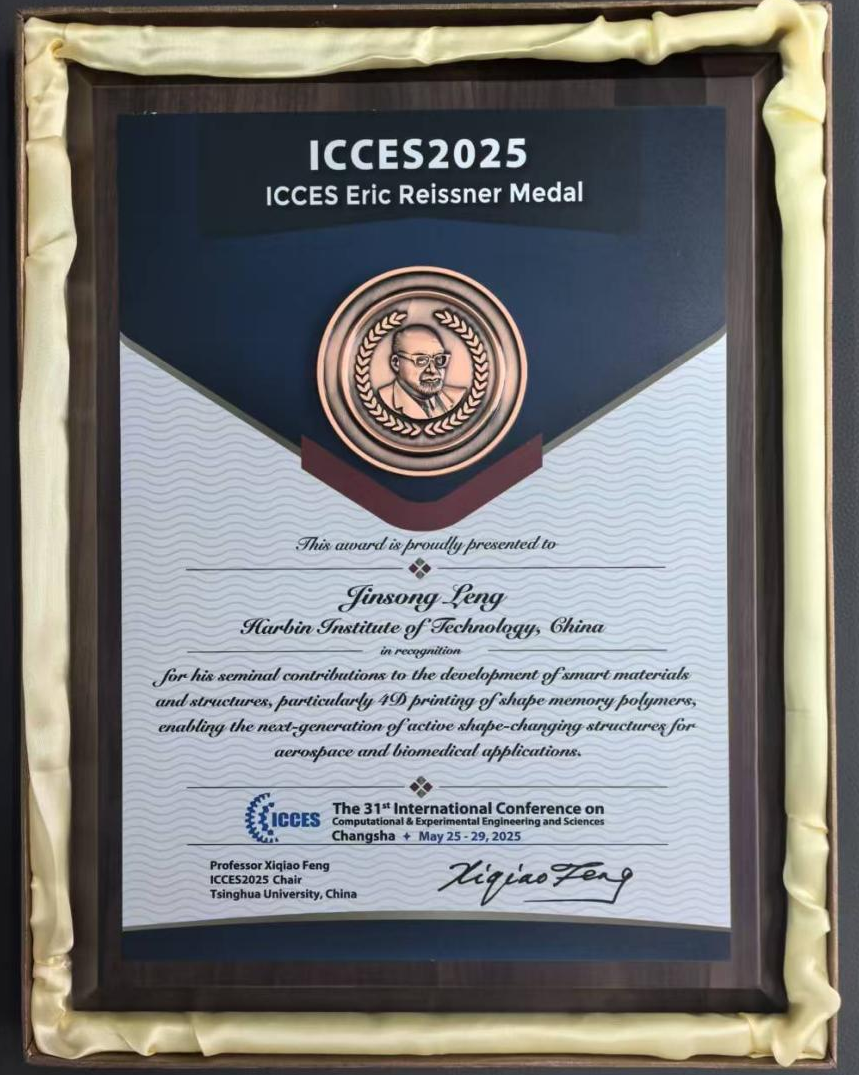 哈工大全媒体(李双余 李丰丰/文 会务组/图)近日,第31届国际计算与实验科学工程大会(International Conference on Computational & Experimental Engineering and Sciences, ICCES)召开,中国科学院院士、我校未来技术学院院长冷劲松教授在会议期间被授予“ICCES埃里克·瑞斯纳奖”(ICCES Eric Reissner Medal),以表彰他在智能材料和结构领域的开创性贡献,特别是在形状记忆聚合物4D打印技术方面的突破性研究,该技术推动了航空航天和生物医学领域新一代主动变形结构的发展。