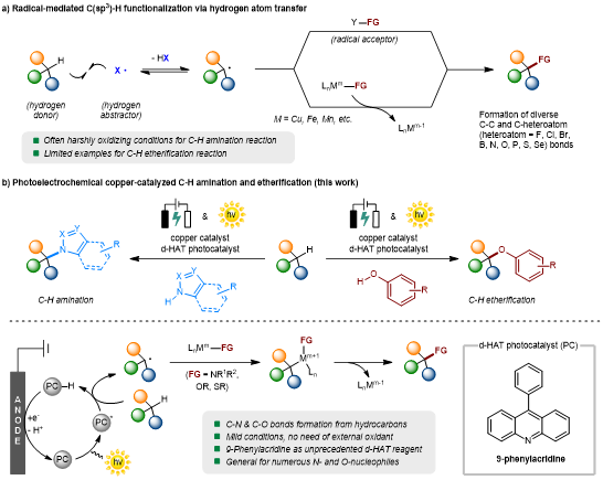 围绕这一关键问题,研究团队利用有机光电协同催化策略,在无需氧化剂的条件下,采用9-苯基吖啶作为新型的光敏剂和氢原子转移试剂,成功实现了铜催化惰性烷烃的碳氢胺化和醚化反应,可以在绿色、温和的条件下将易获得的碳氢化合物直接转化为有更高应用价值的胺类、含氮杂环和醚类产物。该合成策略表现出以下优势:第一,通过调节电化学中反应电流大小精准控制反应速率,使其可以与光化学完美结合,进而实现了碳氢化合物直接sp3碳氢键选择性官能化;第二,无需外加氧化剂,反应条件温和,操作简单,可扩展性强,证明了该方法具有很大的工业应用潜力;第三,该方法表现出了非常广泛的底物适用范围和对不同底物的良好耐受性,不仅适用于各种类型的氮杂环、胺类和酚类作为底物,而且适用于不同的碳氢化合物,包括未活化的简单烷烃、醚类、硫醚、硅烷和酰胺类等均可以参与反应。此外,研究还通过自由基捕获实验、控制实验等机理研究对反应机制进行了详细探索。鉴于氮杂环、胺基和醚基结构广泛存在于天然产物和药物分子中,该研究为药物分子的后期选择性修饰提供了新的方法,为未来的新药研发工作提供了新的指导思路和方向。