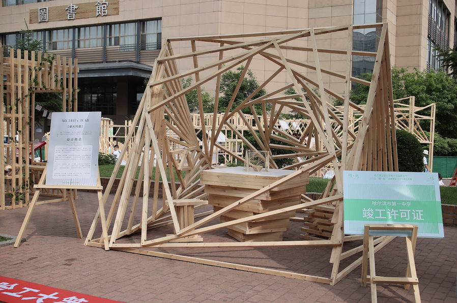 比赛中,来自哈工大和多所高中的学生积极交流实践,打造出风格多样、构思新颖的作品。由建筑与设计学院2024级本科生闫月嘉、王朔、王思予、贾宇巍、郭冰灿、关湘莹、王梓旭7名同学完成,郭海博教授指导的作品《叠光栖屿》和由建筑与设计学院2024级本科生翟翌萱、邹明璇、杨砚淇、宋水木、余翌霏、齐皓天、蔡先迪、战静雯、沈良茜9名同学完成,王未副教授指导的作品《邻里织间》获大学组一等奖。哈尔滨市第一中学高天宇、宋青璇、周嗣哲、郭吉成、栗熇然、姜宇、赵美伊、马一宁、满知衡、刘鸿芊10名同学完成的作品《漫光同晨》和哈尔滨市第三中学刘洪睿、张姝妍、方俊贤、路航、孙浩天、李峻熙、蔡昌越、付然、王梓朝、陈妍、赵子涵、李卓奇、郑欣睿13名同学完成的作品《织光》获高中组一等奖。相关优秀作品将在校园内继续展示,面向公众开放参观。