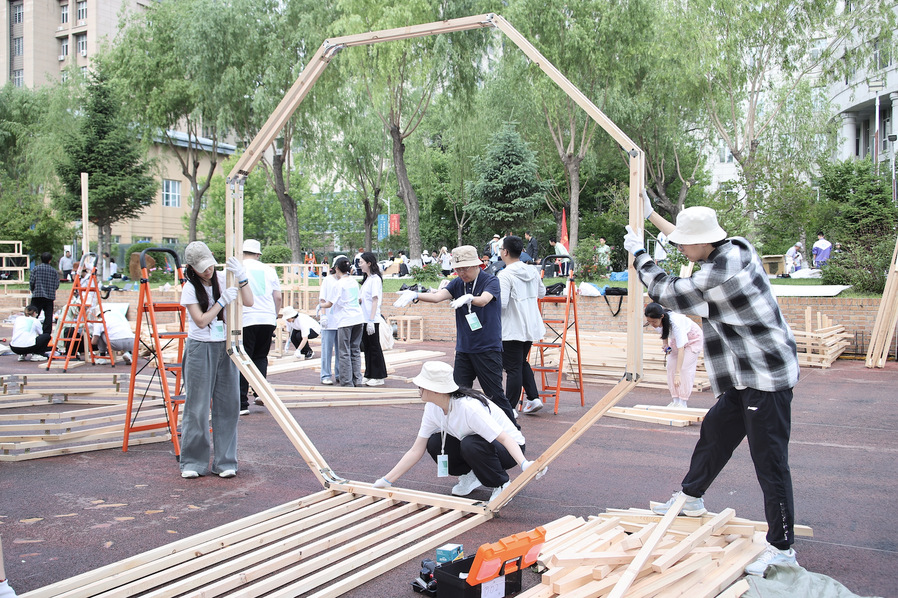 哈工大全媒体(阚思邈 孙适 杨晨璇 邢益泽/文 建筑与设计学院/图)量尺、锯木、钻孔、固定……图书馆前的广场上,一件件结构新颖的木质结构经学生之手雕琢成型,吸引不少师生驻足围观。在收到习近平总书记贺信5周年和建校105周年之际,6月13日至15日,哈工大第十五届建造节暨2025“慢∙光”木构建筑设计与建造竞赛在校举行。副校长沈毅出席并宣布建造节开幕。