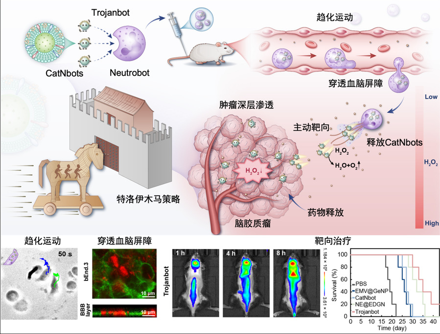面对这道医学难题,团队创新性提出了“特洛伊纳米机器人(Trojanbot)”概念,将酶驱纳米机器人(CatNbots)搭载进活性中性粒细胞机器人(neutrobot)中,通过细菌膜“伪装”技术,将负载药物的酶驱纳米机器人(CatNbots)巧妙“隐藏”在中性粒细胞机器人内部,避开了机体自身的免疫监视。借助中性粒细胞对肿瘤化学信号的天然敏感性,这支“特洛伊纳米机器人部队”能自主感知肿瘤释放的化学信号因子梯度,主动跨越血脑屏障后快速释放出搭载的酶驱纳米机器人。这些酶驱纳米机器人能自主感知肿瘤代谢产生的过氧化氢(H2O2)浓度,突破肿瘤微环境多重生理屏障后主动深入肿瘤病灶中心,就像“精准导航的无人潜艇”,显著提高了药物的组织渗透性和靶向性。活体实验结果表明,其主动靶向效率是常规纳米载体的5倍,有效抑制了肿瘤生长。同时,该系统具有良好的安全性和生物相容性,展现出优异的治疗潜力。这一创新策略不仅有望改变脑胶质瘤的治疗格局,还可为阿尔茨海默病、帕金森病等其他脑部疾病的精准治疗带来希望。