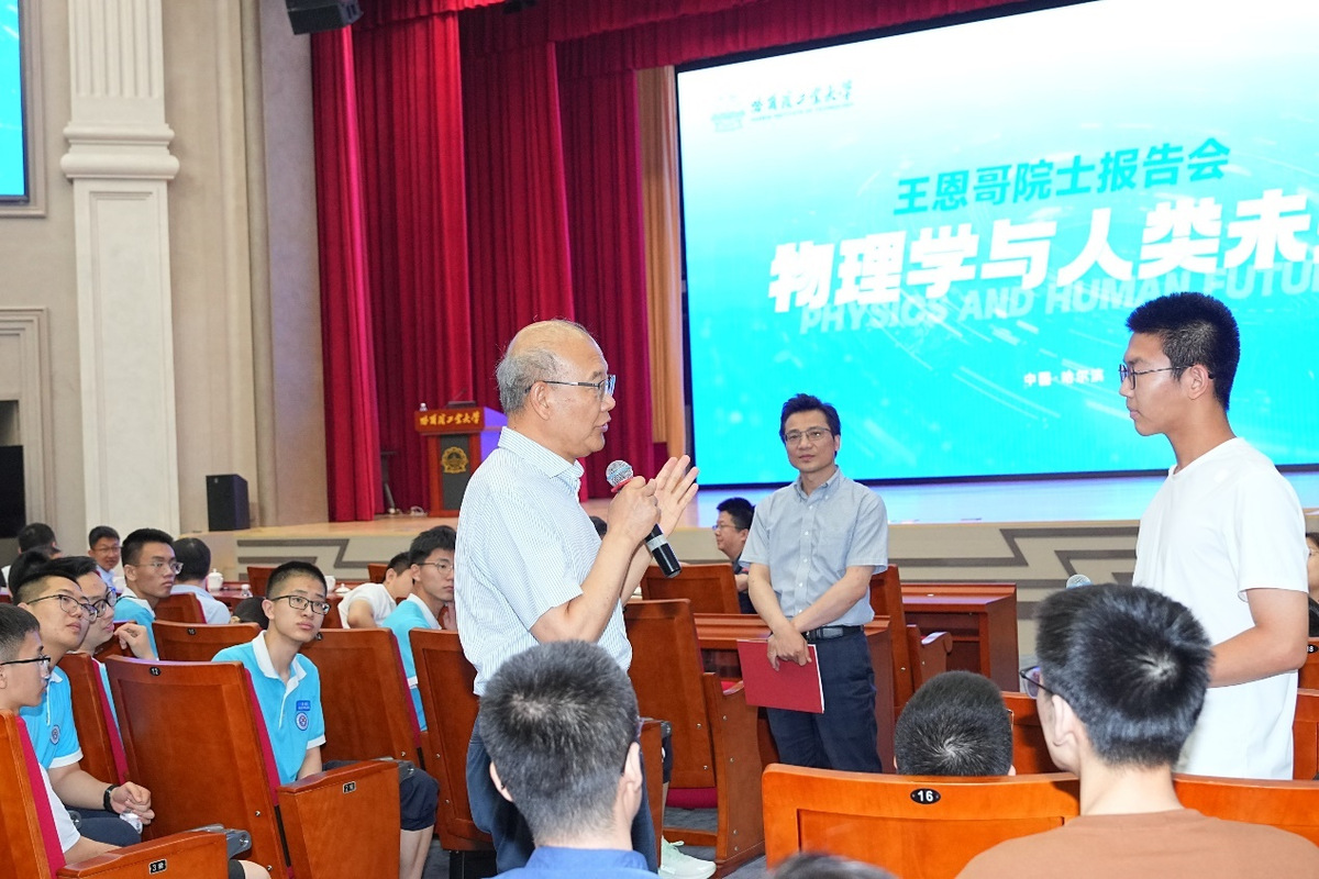 在校期间,王恩哥院士以《物理学与人类未来》为题,面向黑龙江省2025年“中学生英才计划”全体学员和来自哈尔滨市重点中学以及我校师生代表作科普报告,带领师生穿越物理学的时空长廊,从经典物理学的奠基到现代物理学的革命性突破,展望物理学对人类未来的深远影响。报告会后,王恩哥院士与现场学子进行了互动交流,结合个人成长经历勉励学子“坚定科技报国志,保持对科学探索的兴趣,努力成长为拔尖创新人才,为推进强国建设、民族复兴伟业贡献智慧和力量”。