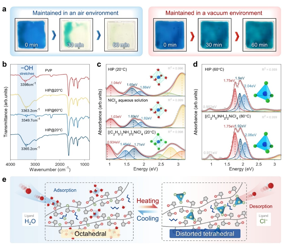 团队结合原位变温谱学、电子磁性表征等手段,系统揭示了水合离子聚合物材料中Ni2+配位构型动态重构的光谱响应机制,进一步通过控制膜厚和环境湿度,实现了分钟级着色与褪色的快速响应特性,并构建了基于Clausius-Clapeyron方程的转变温度预测模型,为不同气候区域的应用提供了理论支持。