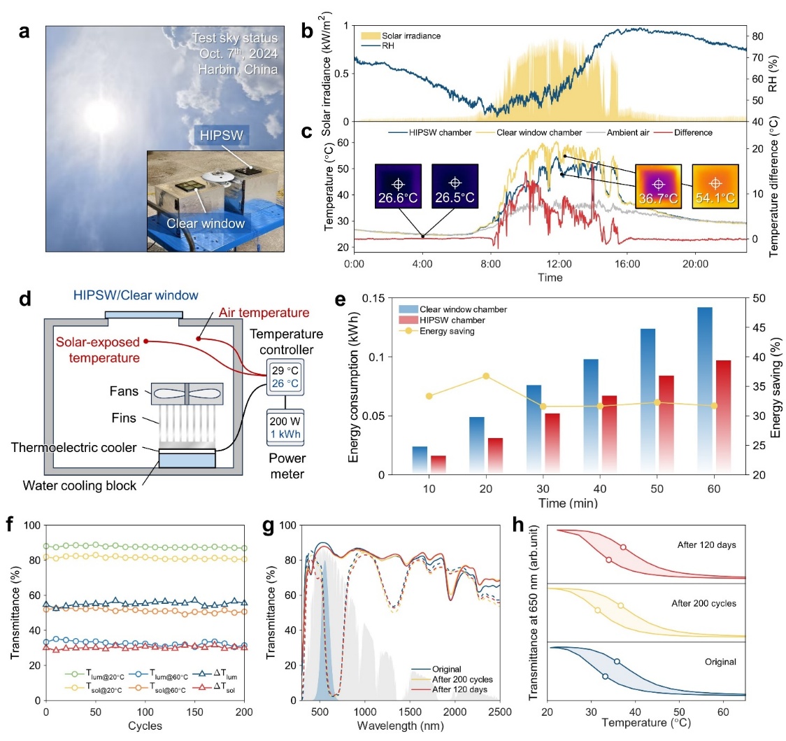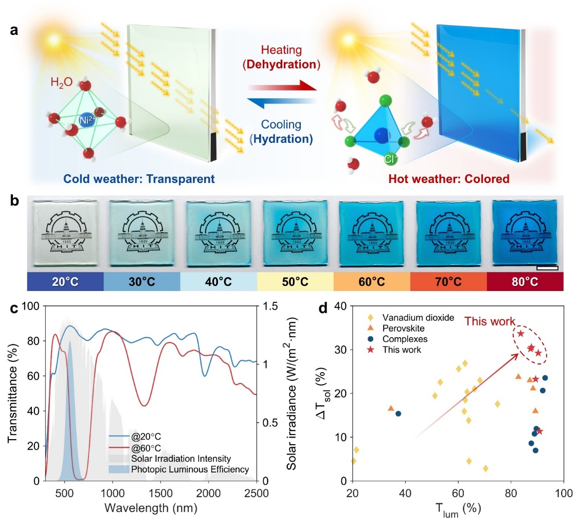 哈工大全媒体(张又元 王怀远/文 王怀远/图)近日,我校能源科学与工程学院高继慧教授团队在窗体节能及光热管理领域取得重要进展。团队开发出一种基于水合离子聚合物的热致变色薄膜,成功实现了无色态与着色态间的无雾度可逆转变,为新一代节能窗体设计及光热管理提供了新思路。研究成果以《用于建筑热致变色节能窗的水合离子聚合物》(Hydrated ionic polymer for thermochromic smart windows in buildings)为题发表在《自然通讯》(Nature Communications)上。