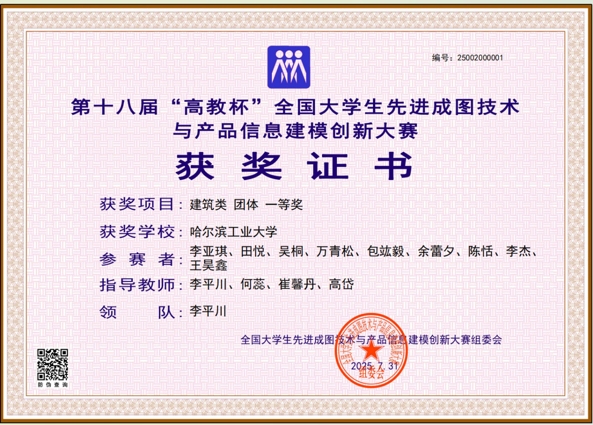 获得建筑类团体一等奖的代表队由建筑与设计学院李亚琪、田悦、吴桐、万青松、包竑毅、余蕾夕、陈恬、王昊鑫,交通科学与工程学院李杰组成,机电工程学院李平川副教授、何蕊副教授、高岱老师、崔馨丹老师担任指导教师。