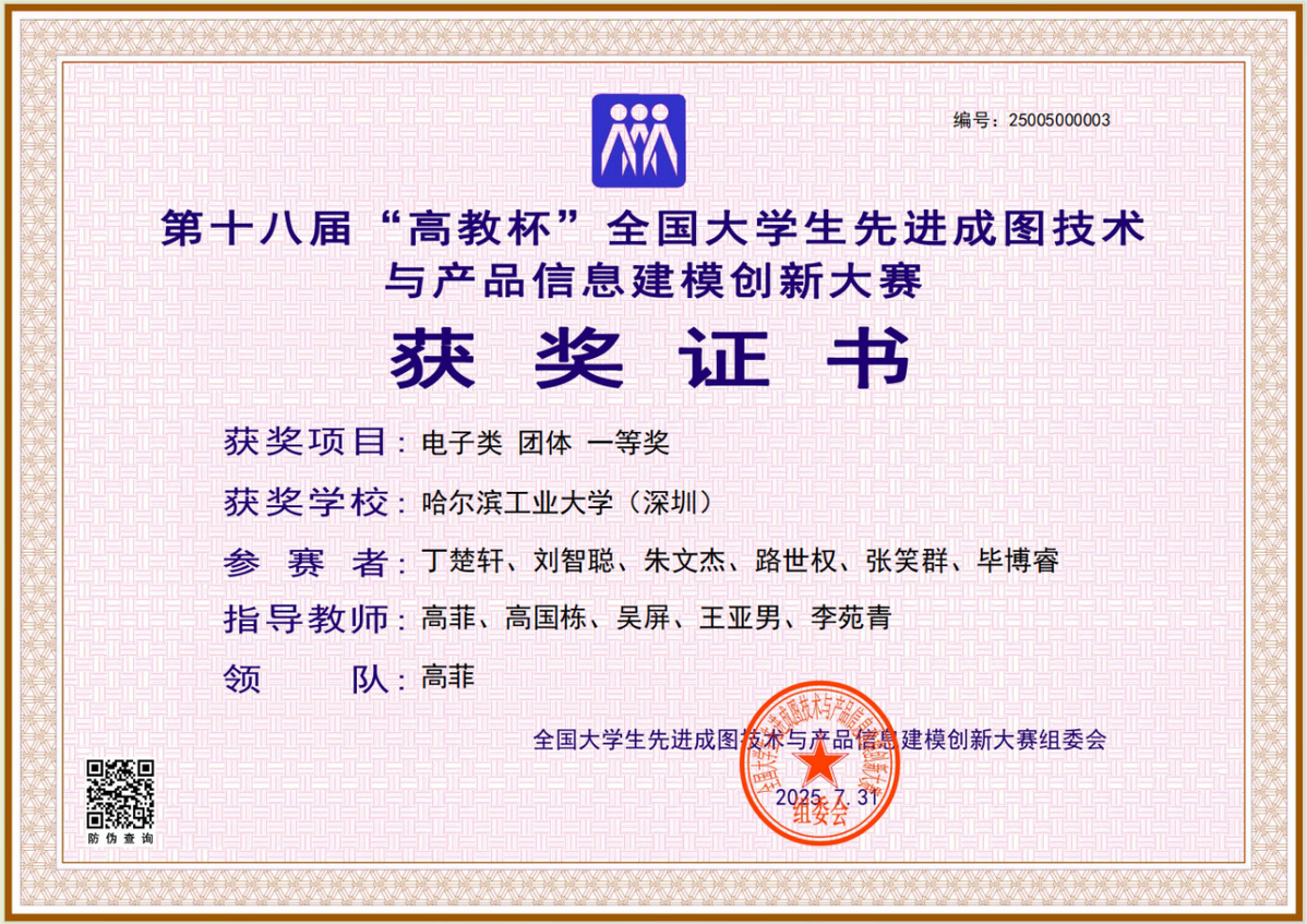 获得电子类团体一等奖的代表队由深圳校区丁楚轩、路世权、刘智聪、朱文杰、张笑群、毕博睿组成,高菲实验师、高国栋实验师、吴屏高级实验师、王亚男实验师、李苑青高级实验师担任指导教师。