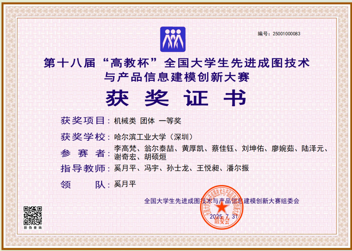 获得机械类团体一等奖的代表队分别是:由建筑与设计学院罗玮昕,未来技术学院赵家瑞,机电工程学院熊知乐、李梓嘉、卢思涵、金奕名,航天学院马骁、仪器科学与工程学院李泳含组成,机电工程学院姜文锐副教授、曲焱炎老师、宫娜副教授、王迎教授担任指导教师;由深圳校区李高梵、翁尔泰喆、黄厚凯、蔡佳钰、刘坤佑、廖婉茹、陆泽元、谢奇宏、胡硕烜组成,奚月平实验师、冯宇教授、孙士龙副教授、潘尔振助理教授、王悦昶助理教授担任指导教师。