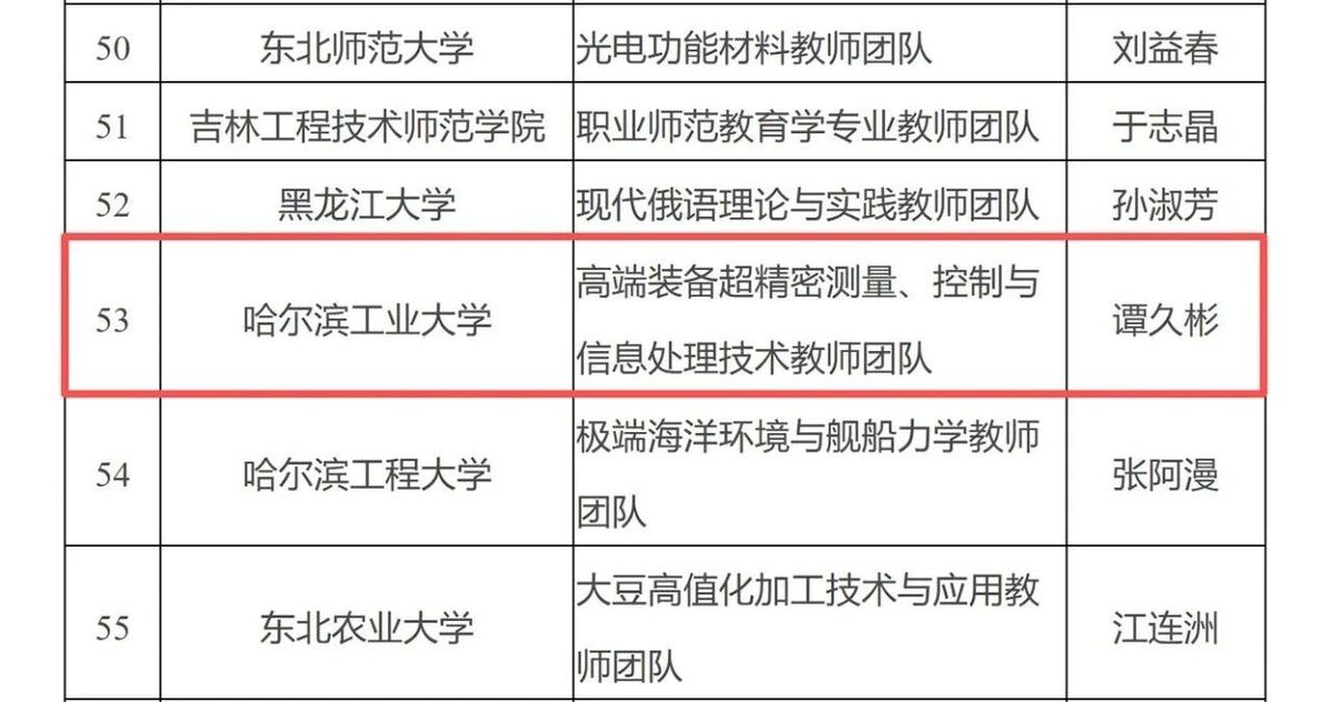 哈工大全媒体(张又元/文)近日,教育部公布第三批“全国高校黄大年式教师团队”创建示范活动认定名单和第四批“全国高校黄大年式教师团队”创建示范活动入围名单,我校高端装备超精密测量、控制与信息处理技术教师团队入选第三批“全国高校黄大年式教师团队”创建示范活动认定名单,城市水环境与可持续发展教师团队入选第四批“全国高校黄大年式教师团队”创建示范活动入围名单。这是继卫星技术研究所教师团队,宇航空间机构及控制技术教师团队,高端装备超精密测量、控制与信息处理技术教师团队之后,我校第四次入选“全国高校黄大年式教师团队”。