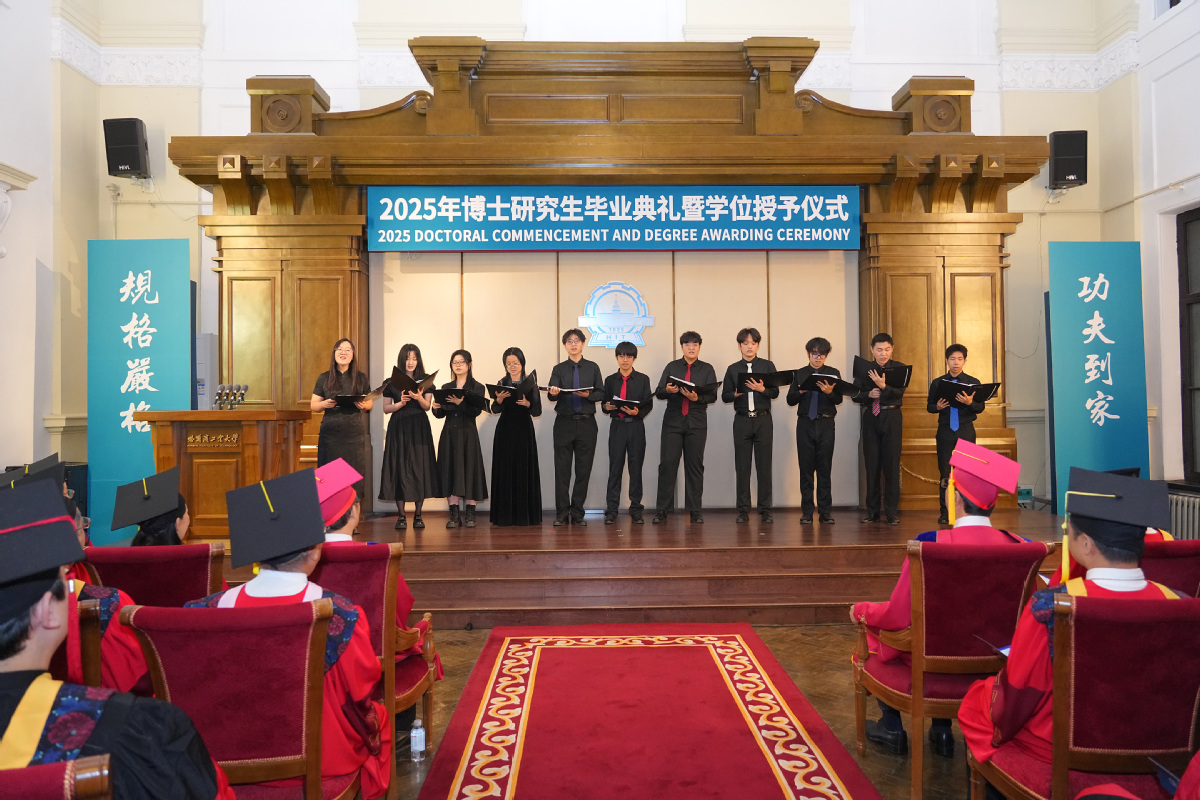 悠扬的歌声响起,国际合唱联盟A级合唱团哈工大MUSICA室内合唱团以《凤凰花开的路口》为博士毕业生送上祝福。