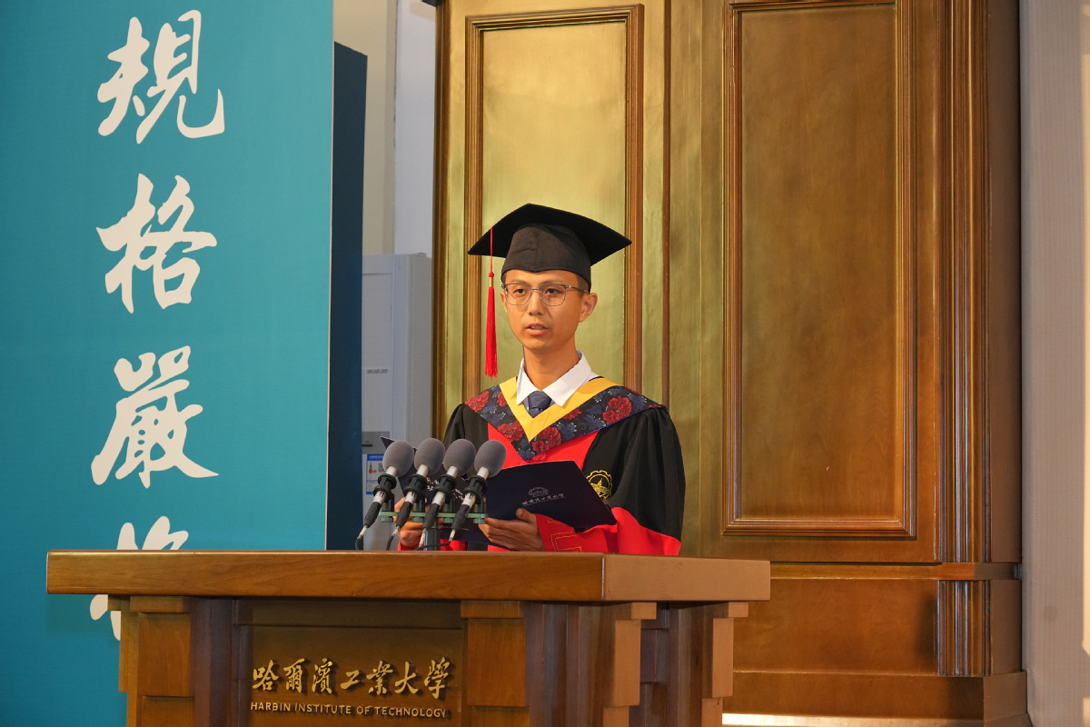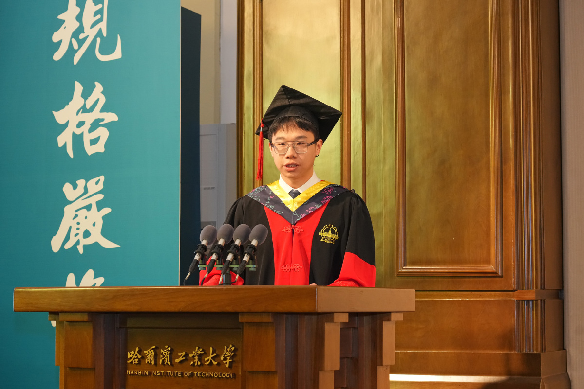 材料科学与工程学院2022级博士研究生姜博涛、土木工程学院2021级博士研究生董宪章分别作为毕业生代表对学校、师长、亲友表示感谢,并表示将继续传承哈工大“八百壮士”精神,瞄准国家重大需求,勇担“尖兵”重任,为实现高水平科技自立自强作出新的更大贡献。