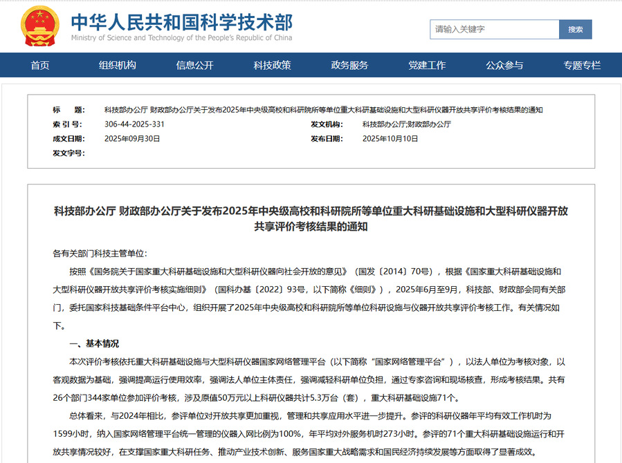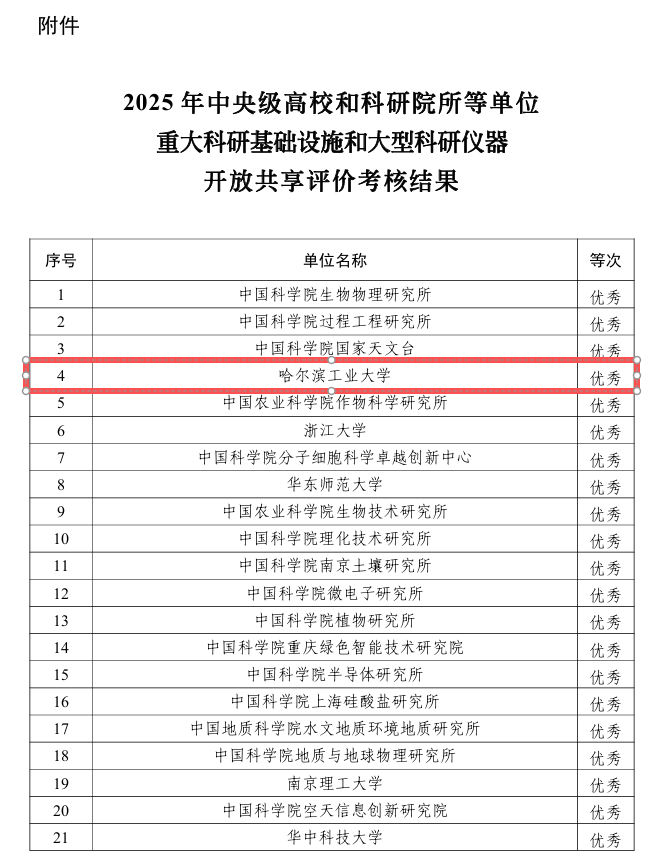 哈工大全媒体(李双余 张琳/文)10月10日,科技部办公厅、财政部办公厅联合发布《2025年中央级高校和科研院所等单位重大科研基础设施和大型科研仪器开放共享评价考核结果的通知》,此次共有26个部门344家单位参加评价考核,我校获评“优秀”,考核成绩连续2年位列中央级高校第一。这是继2022年、2023年、2024年获得“优秀”后,我校再次获得佳绩。
