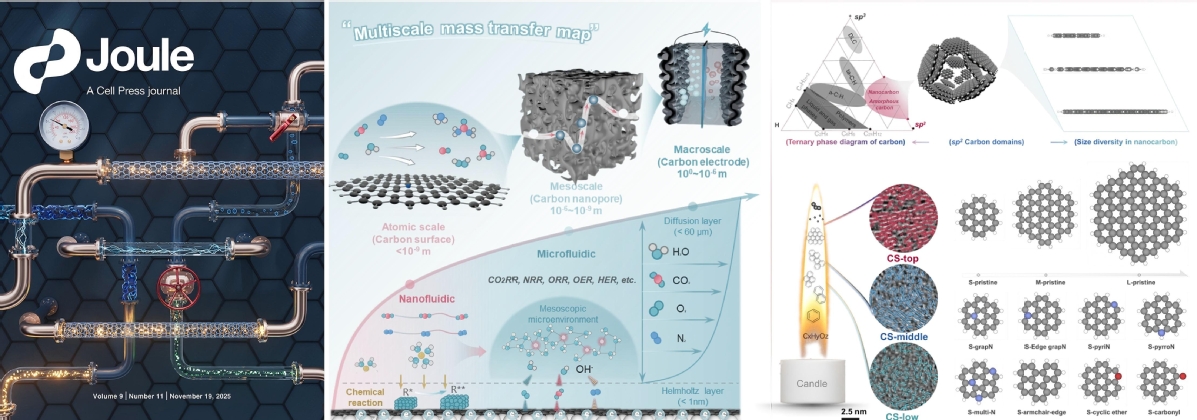 碳基电催化能质转化机制研究。(左)成果入选《焦耳》封面文章;(中)碳基电催化界面多尺度传质路径;(右)纳米碳sp2晶畴尺寸与局域活性位点耦合效应。