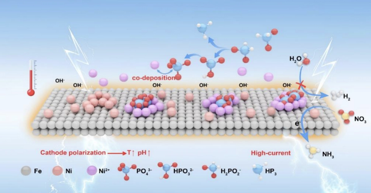 反应机理图:在高电流密度条件下,阴极(泡沫铁)表面迅速形成强碱性局部环境并伴随显著热量释放,协同促进了废水中次磷酸根的逐步歧化反应,将其转化为磷酸根;磷酸根与废水中的镍离子发生共沉积,在电极表面形成磷酸镍涂层。该涂层显著增强了电极对硝酸根离子的活化能力,同时有效抑制了析氢反应,从而实现了优异的硝酸盐还原合成氨性能。