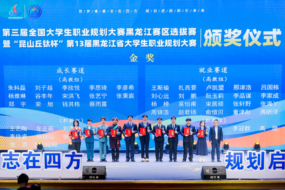 哈工大全媒体(张又元 杨惠博/文 就业指导中心/图)近日,由黑龙江省教育厅主办,黑龙江省大学生就业创业指导中心、东北林业大学、黑龙江大学、黑龙江建筑职业技术学院联合承办的第三届全国大学生职业规划大赛黑龙江赛区选拔赛暨第13届黑龙江省大学生职业规划大赛总决赛落幕。我校师生共获得金奖13项、银奖7项、铜奖4项,金奖覆盖全赛道,金奖数量及获奖总数均居全省高校第一。