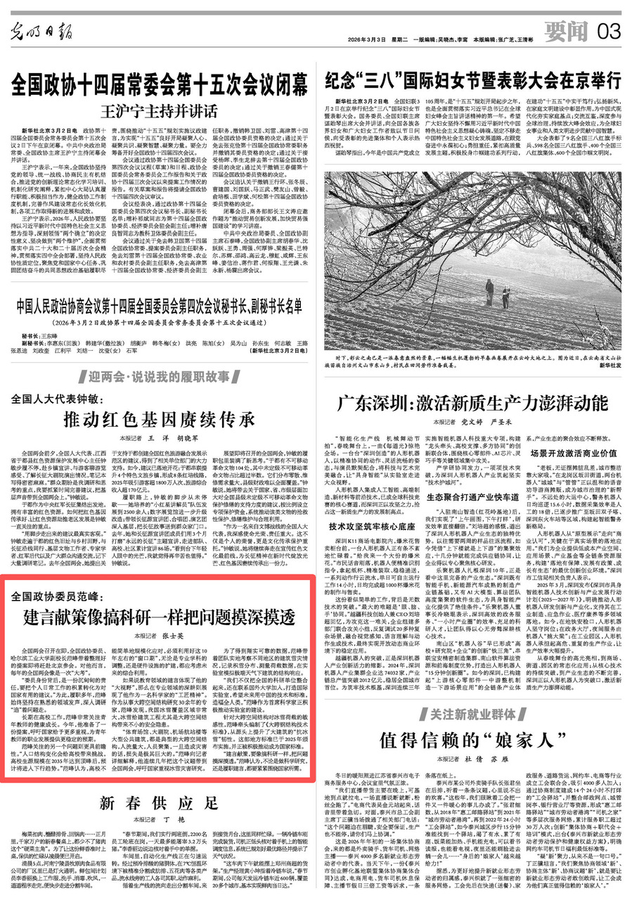 3月3日,《光明日报》“迎两会·说说我的履职故事”专栏刊发《全国政协委员范峰:建言献策像搞科研一样把问题摸深摸透》,光明日报新媒体配发视频,报道我校副校长范峰作为全国政协委员履职多年,始终坚持在熟悉的领域发声,深入调研“追”着问题走。