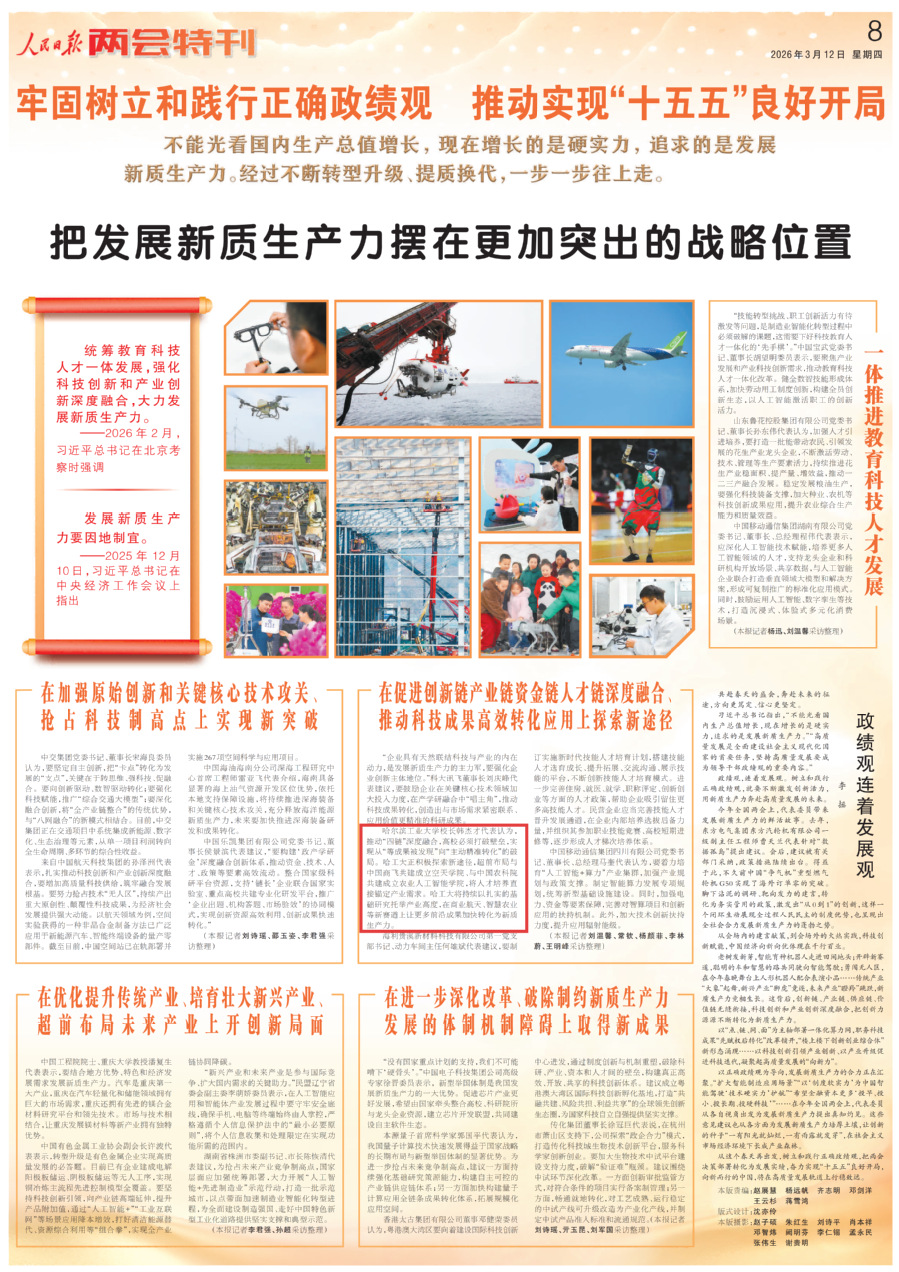 哈尔滨工业大学校长韩杰才代表认为,推动“四链”深度融合,高校必须打破壁垒,实现从“等成果被发现”向“主动精准转化”的破局。哈工大正积极探索新途径,超前布局与中国商飞共建成立空天学院、与中国农科院共建成立农业人工智能学院,将人才培养直接锚定产业需求。哈工大将持续以扎实的基础研究托举产业高度,在商业航天、智慧农业等新赛道上让更多前沿成果加快转化为新质生产力。
